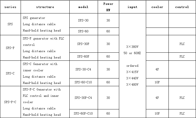 (1) SPS series products: SPS machines are consisted of SPS generator, long distance cable and Portable heating head with 3 or 5 meter long connecting cable.